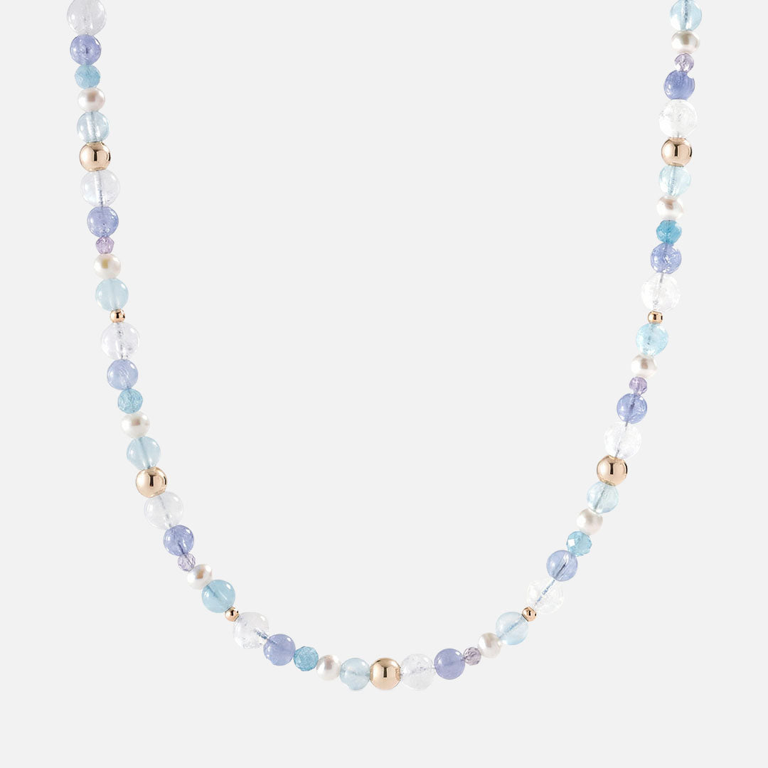 《Moody》系列中以不同層次藍色的天然石混搭的時尚感雙圈手鏈,猶如晴空中朵朵綿雲 ,透過太陽在雲層中的光線拆射下完全呈現在這款手鏈上, 它能增強表達能力及自信心,讓我們心靈舒暢和平靜,減少我們內心的焦慮,功效上很適合經常感到緊張和容易焦慮 ,需要經常溝通及演講的人。