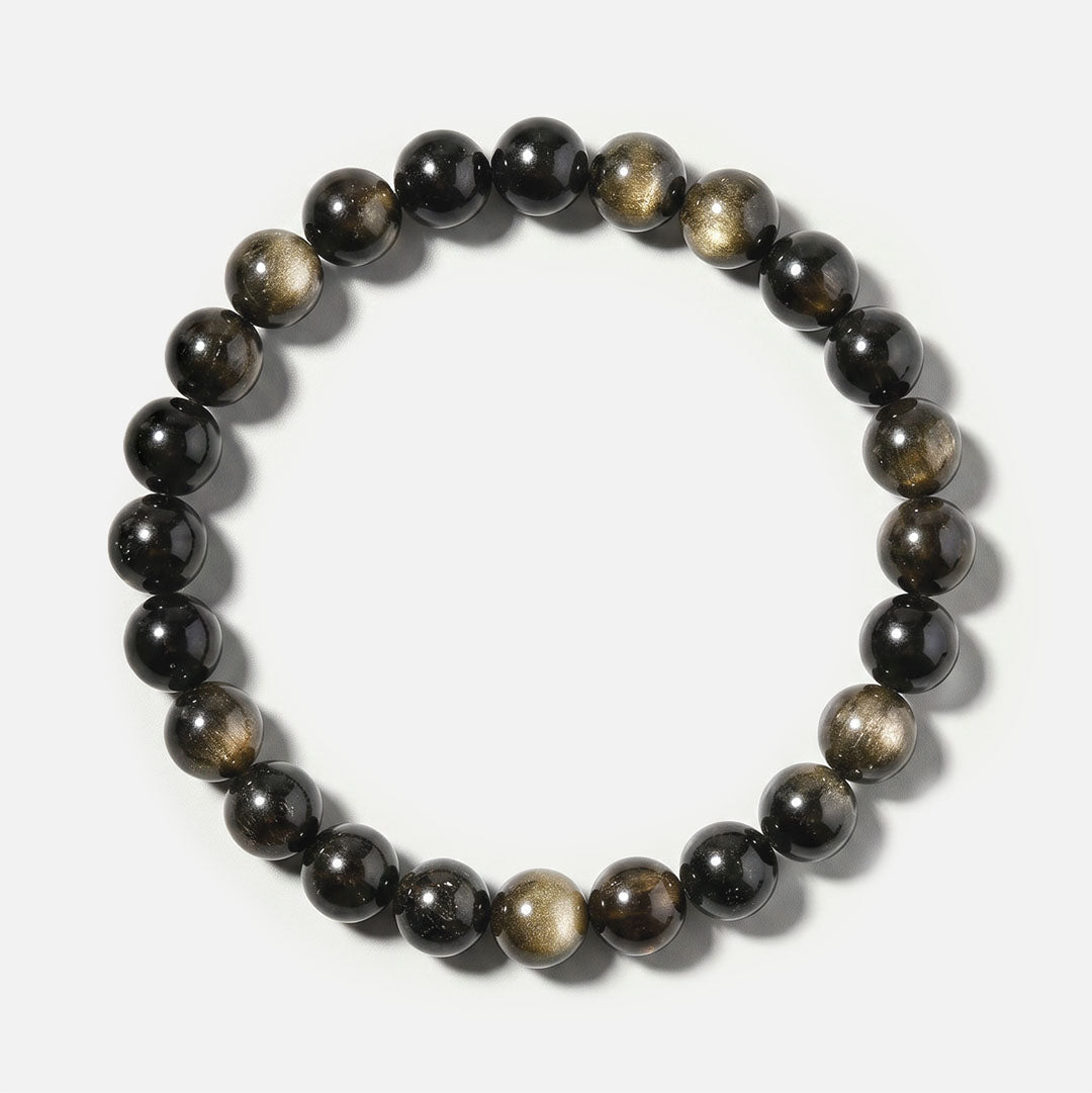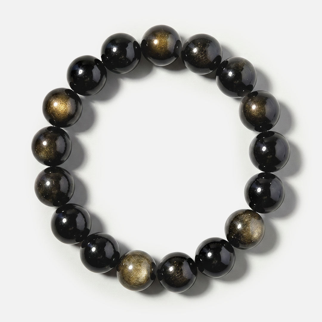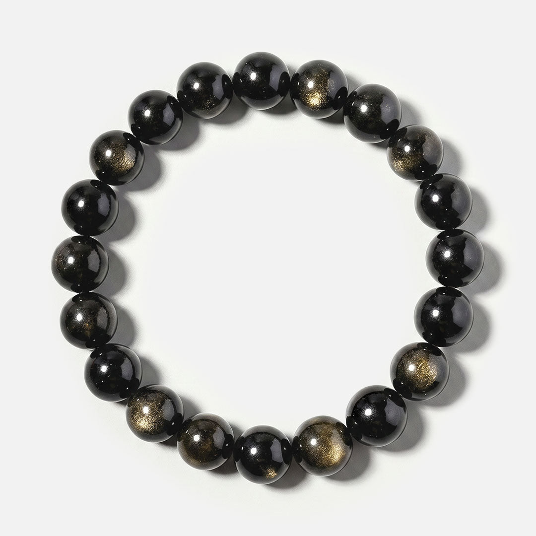 金曜石又名金沙黑曜石,深邃黑底之中流轉亮金色光澤,如星光凝固於石。金曜石寓意守護與淨化,在東方理論中,被認為能抵禦負面能量、除病氣、消除壓力與疲勞、穩定身心狀態,為佩戴者帶來沉穩而有力的守護。