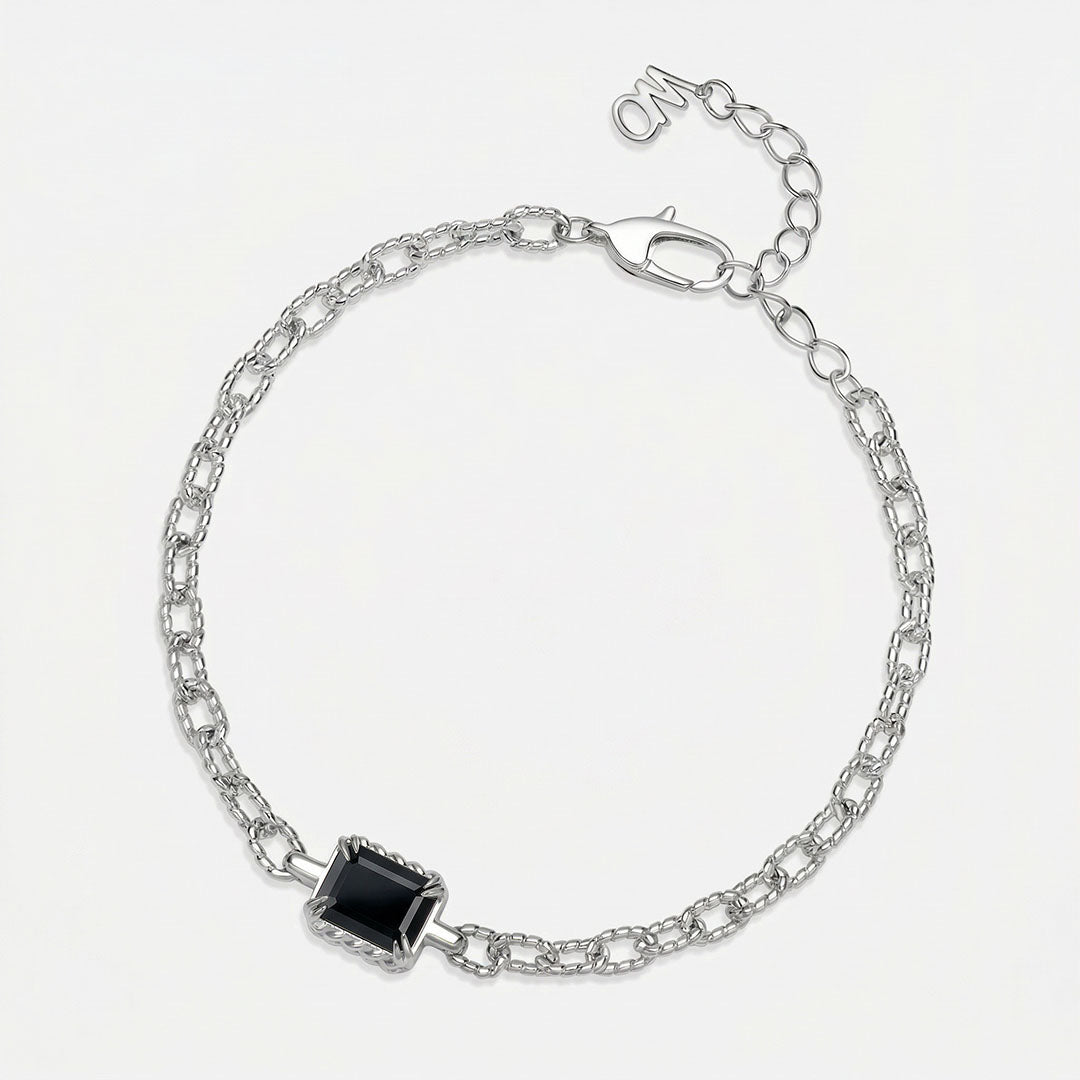 The KNIT bracelet pairs a woven-texture frame with clean industrial lines — a deliberate tension between craft and edge. A faceted octagonal-cut semi-precious stone sits at the center, adding a quiet flash of natural color to a considered silhouette. Finished with a classic braided chain. Wear it alone or stack it — either way, it holds its own.