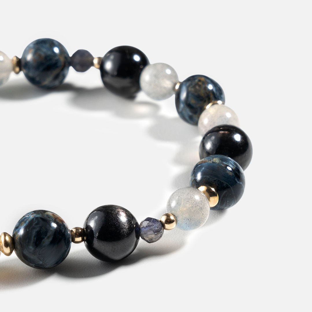 拉長石也稱為灰月光石,經光線的照射會出現七彩光暈,它具有療癒的能量,對於長時間工作者有助於增強意志力、放鬆心情及疲倦。另外,拉長石能加強我們對事情的洞察力,免於被表面的假象迷惑。