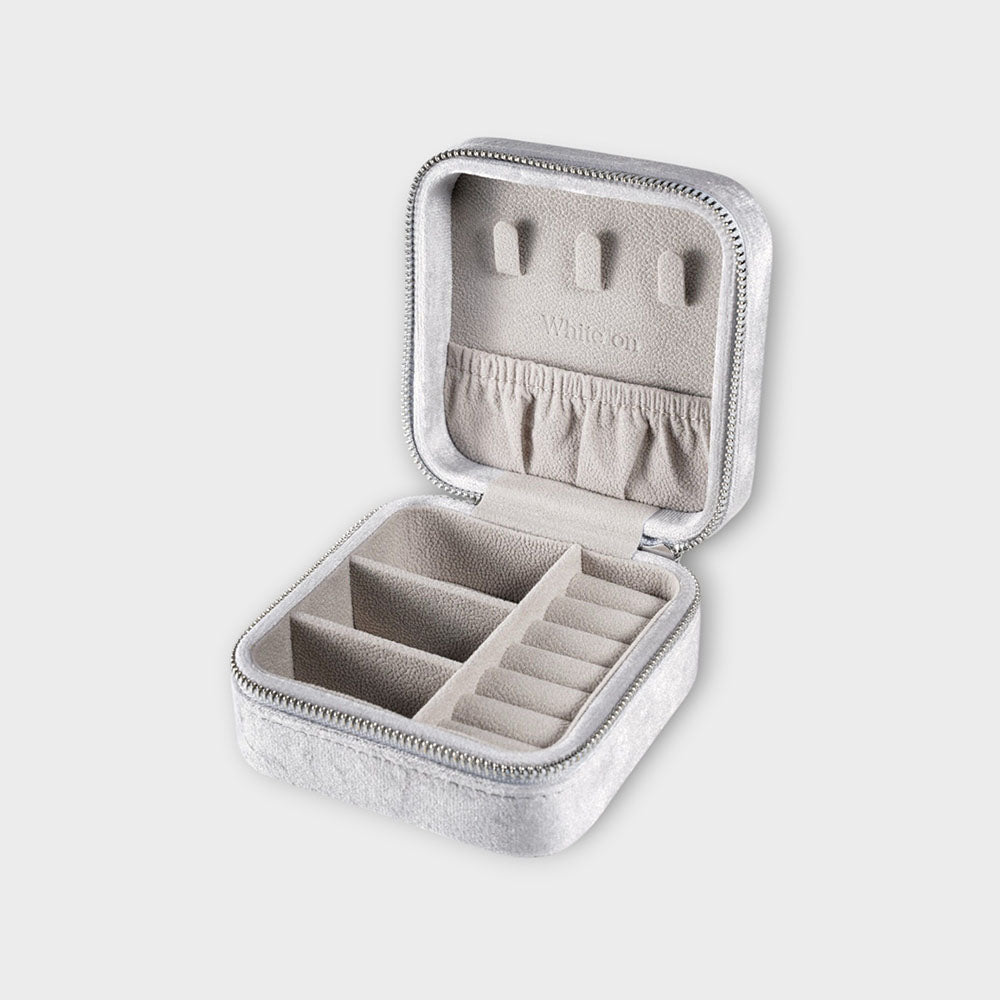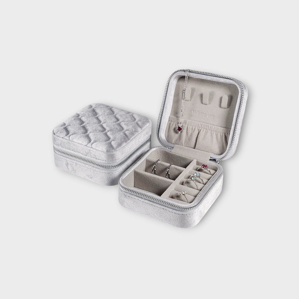 【專屬限定禮遇】於 White on 門市或官網單筆消費折後滿HK$1,200,即可獲贈價值HK$400 White on 霧灰絲絨首飾盒(一個)。霧灰絲絨外觀,盒面水波紋車線精緻點綴,細節呼應品牌標誌,低調而不失質感。輕巧便攜,居家收納或旅行隨身皆宜,自用送禮同樣合適。只限門市領取,數量有限,送完即止。
