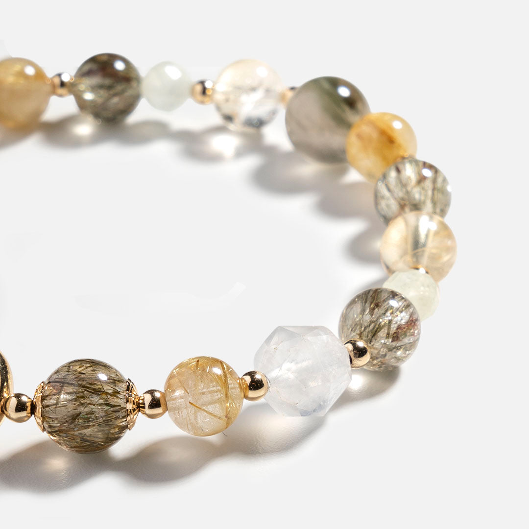 款式使用多種招正財和偏財運的水晶混搭以成,幫助你在事業上帶來更多機遇,同時為我們提升財富。 精緻的金髮晶吊飾及包圈為手鏈帶來不一樣的細節,精緻動人,更顯獨一無二。