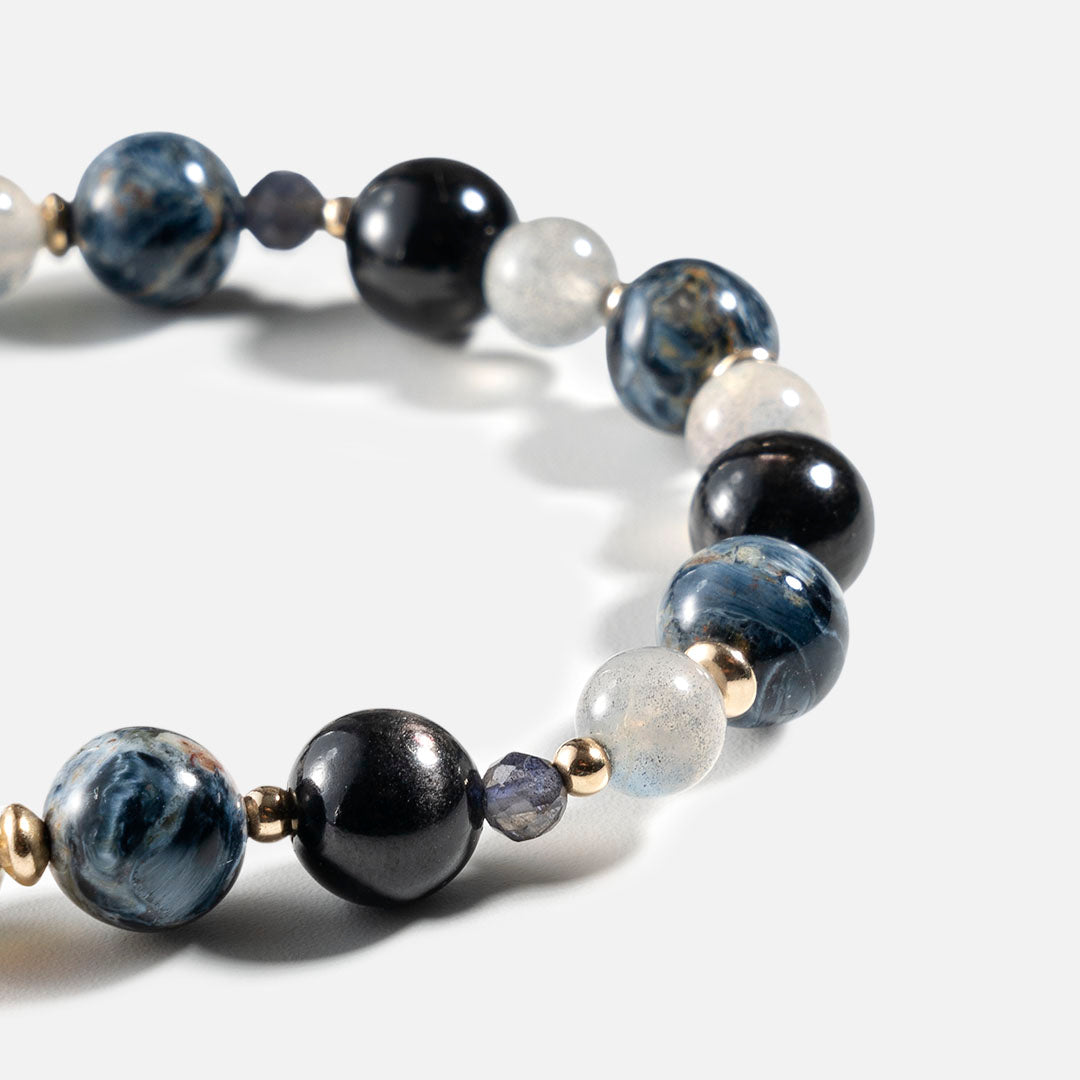 金運石又稱為紫蘇輝石、銀線石、黑銀線,它漆黑帶有光澤的外觀下,並散發出耀眼金屬光芒,同時具有辟邪擋災、防小人、化太歲及強大的招財功效。另外,金運石讓我們投資或作決定的時候直覺更準確,從而提升財運,並能輔助我們提升自身的運氣,傳聞說金運石在埃及是被禁止攜帶進入賭場,可想言之它在帶來的招財的功效非常顯著。這款手鏈適合同時佩戴在左手或右手。