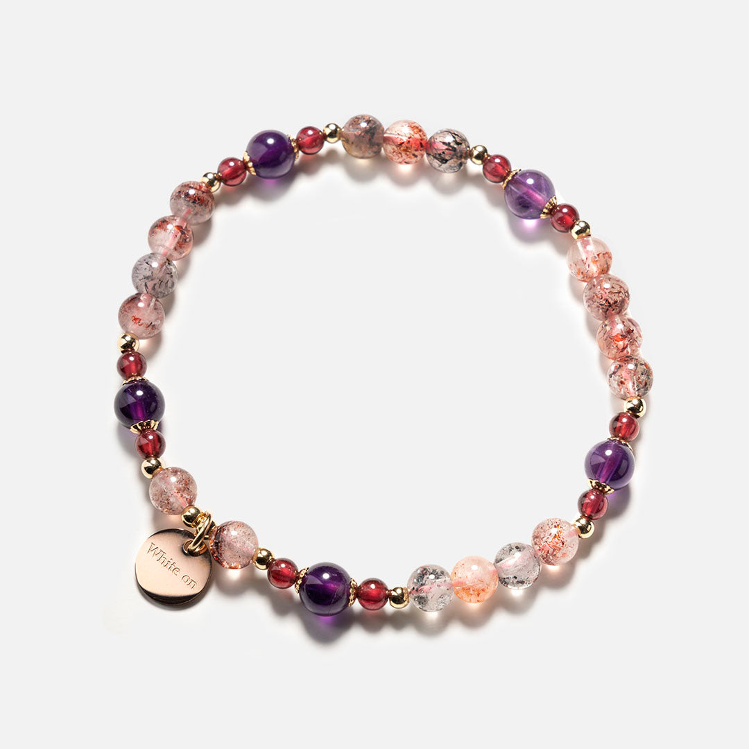 這款手鏈以草莓晶、月光石和紅紋石為主,搭配14K包金,仿手鐲的設計簡約而精緻,在任何場合日常都能輕鬆搭配,讓您散發自信和魅力。