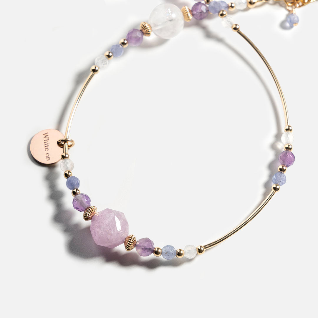 這款水晶手鏈設計採用雙圈款式,融合了紫鋰輝、白幽靈、紫水晶等水晶礦石,並使用星鑽形狀和圓形珠子交錯細節,更顯優雅細膩。
