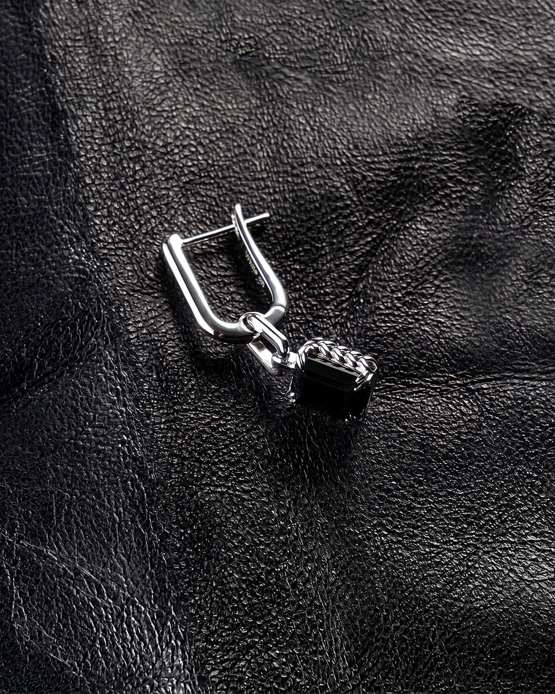 WHITE ON 織紋黑瑪瑙耳環,以細緻編織紋理為主體邊框,中央鑲嵌小八角石,工業與優雅共存,U型設計簡約俐落。