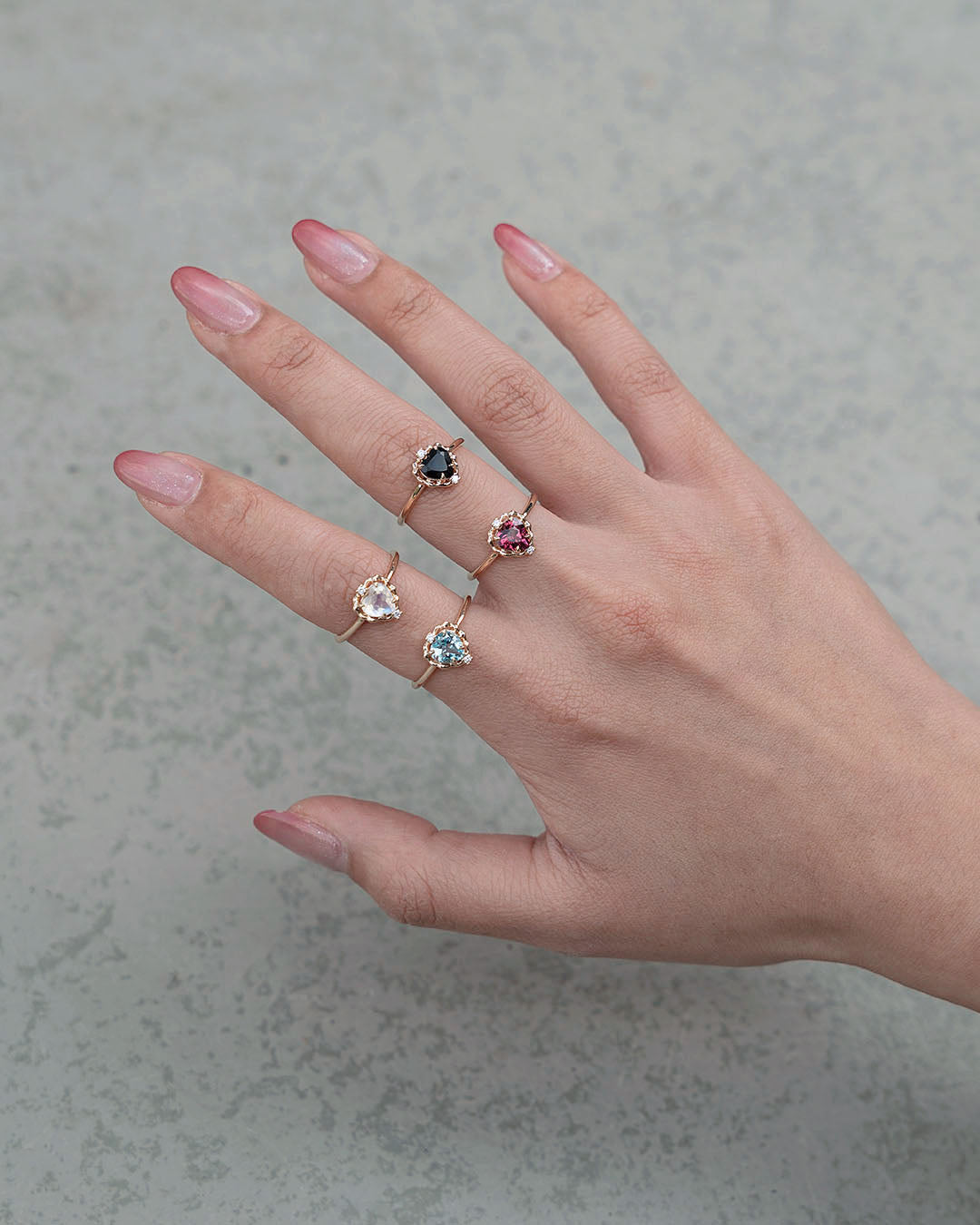 Wavy Heart 戒指以不規則的波浪形邊框為特色,上下鑲嵌的鑽石更添閃耀,完美點綴心形的藍托帕石,凸顯這款半寶石的獨特美態。簡約而精緻的設計展現出強烈的設計感,幼身戒臂容易搭配造型,無論是日常造型還是特別場合,這款戒指都能為您增添優雅與魅力。