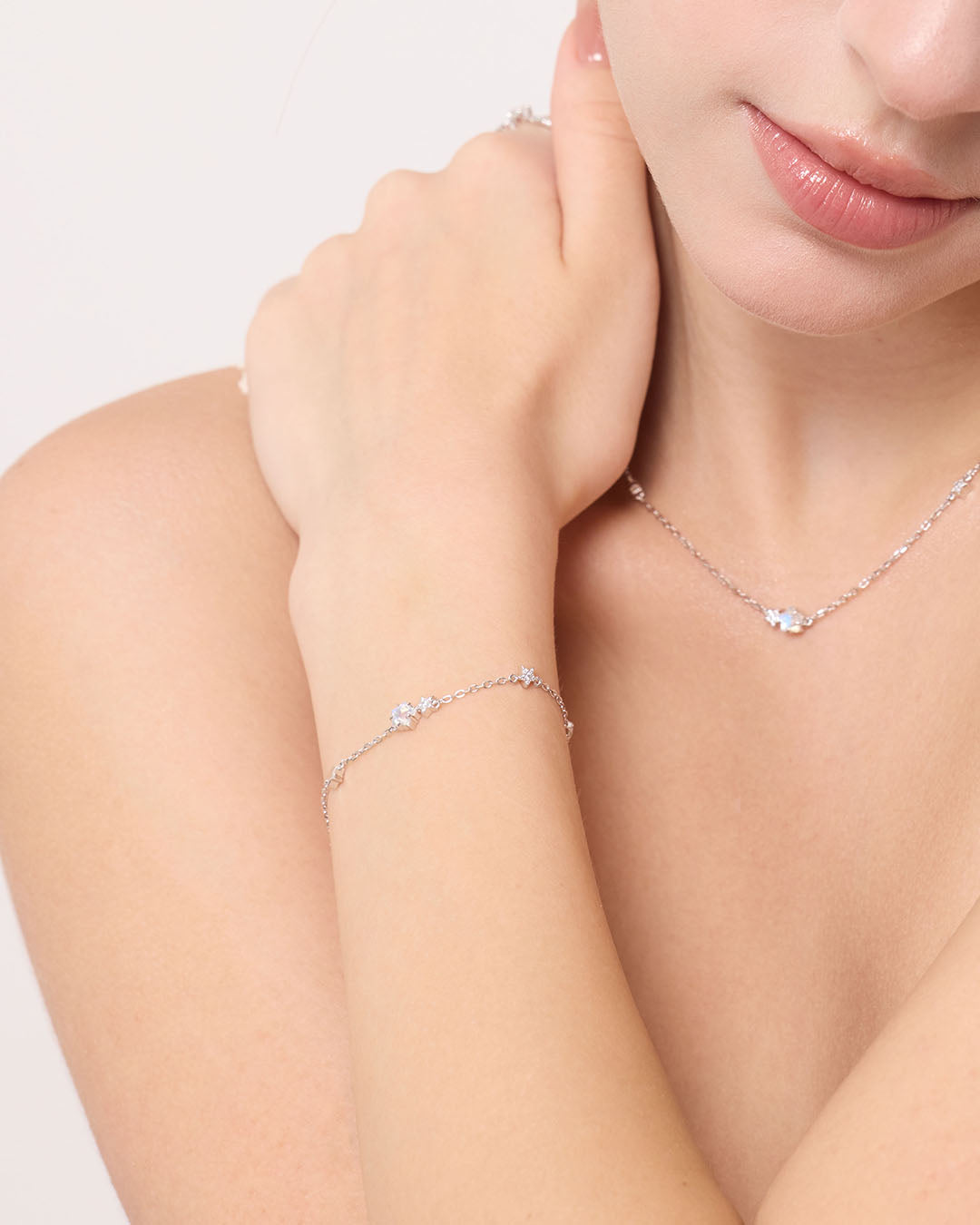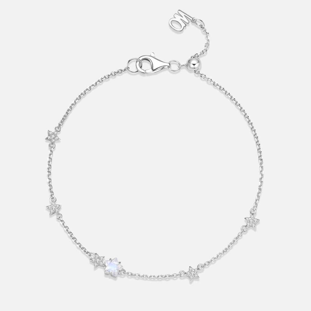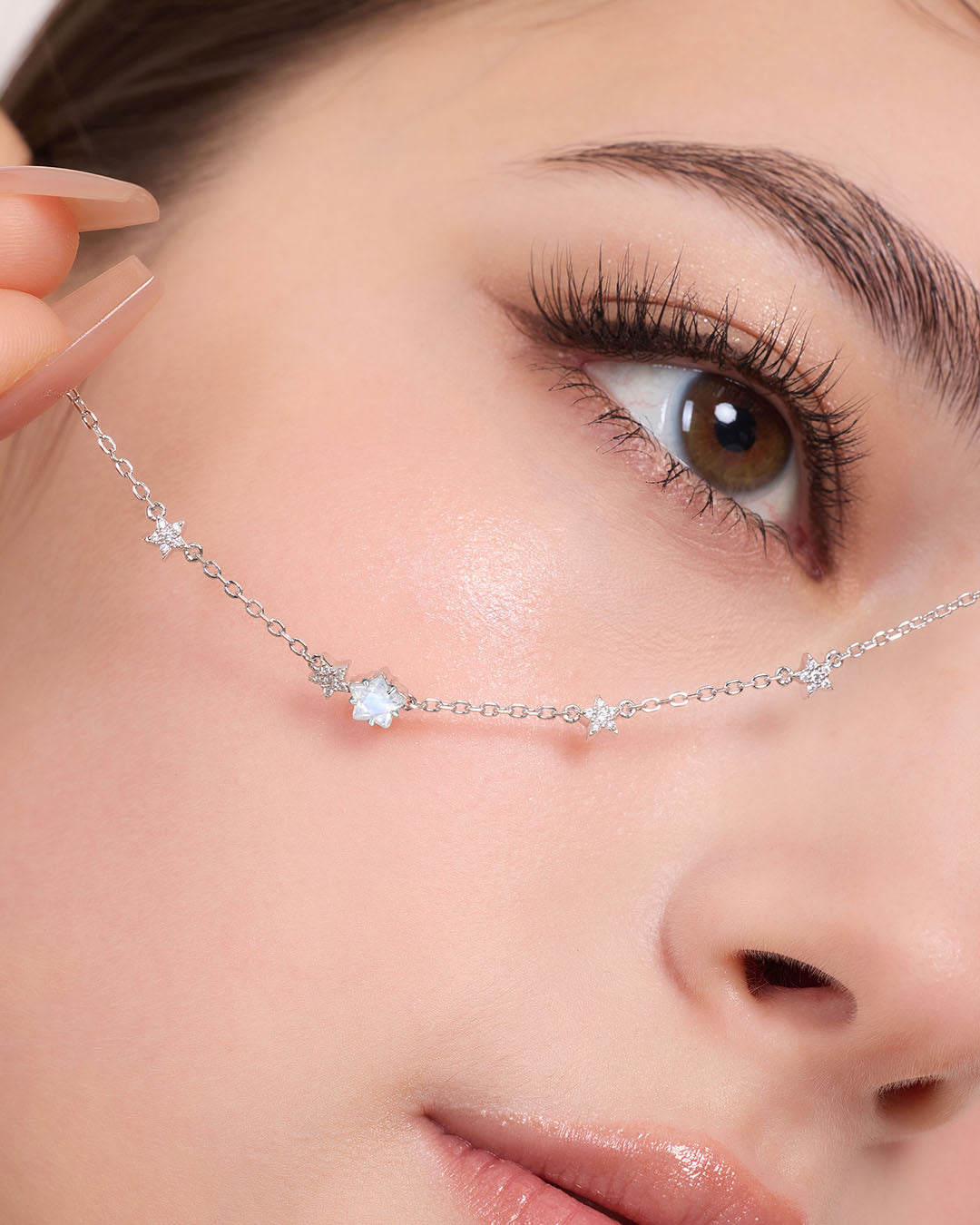 星星手鏈串連細緻小星星與璀璨主星,於腕間展現夢幻星河。 每顆小星星雙面鑲嵌高亮鋯石,閃爍如流星劃過天際,中央主星則鑲嵌星型半寶石,象徵希望與祝福。手鏈採用可調節珠扣設計,輕鬆調整長度,舒適貼合各種手圍。無論日常或特別場合,「THE STAR」都為你增添自信光芒,成為焦點,將專屬星光溫柔繫於腕間。