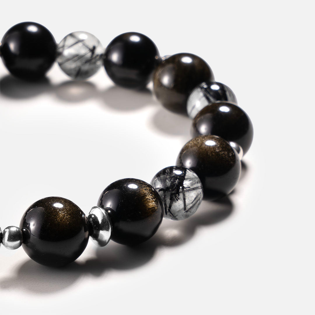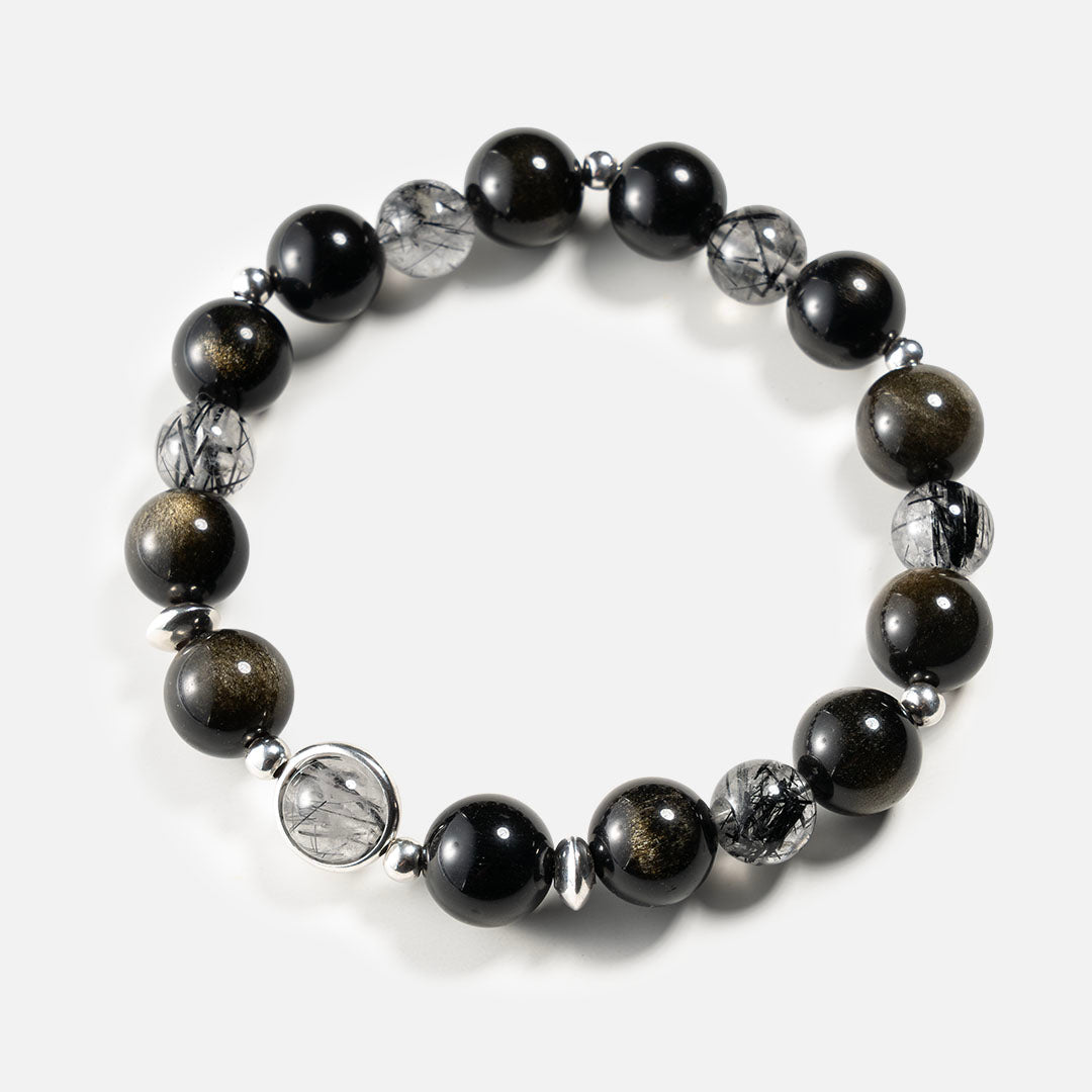 金沙黑曜石是一種內含亮金色物質的黑曜石,被認為有抵禦、吸收負能量和護身的功效,能防小人及邪術,有極度辟邪化煞作用,可以避免負能量的干擾,有助吸收和消除壓力、濁氣等負能量。