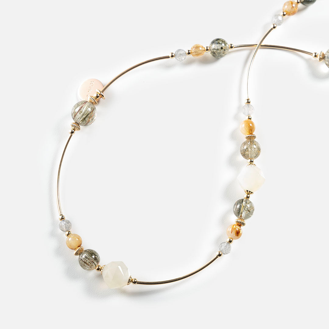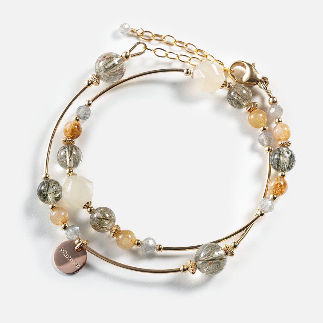這款手鏈主要以綠髮碧璽、金鈦晶和星鑽型白月光石組成的設計,它擁有吸引正財和偏財運的功效,助您開啟事業上的機遇並增加財富,而月光石則讓我們心靈得到平靜。雙圈手鏈獨特華麗的設計使您在任何場合都能閃耀著迷人的光芒。