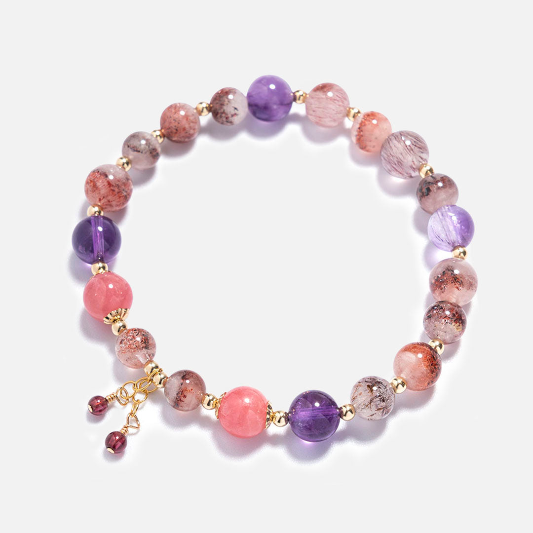 款式利用大小珠的混搭,把色彩繽紛的超級七帶來層次感,細節加入能招來好姻緣的紅紋石,另外,用人手繞線的石榴石吊節,充滿高貴優雅的氣質。超級七在水晶當中它能量比較強,包含七種礦物和功效,功效較全面,源源不絕的能量會帶來了好運氣,跟其他水晶一起配戴,能加強它們的能量。